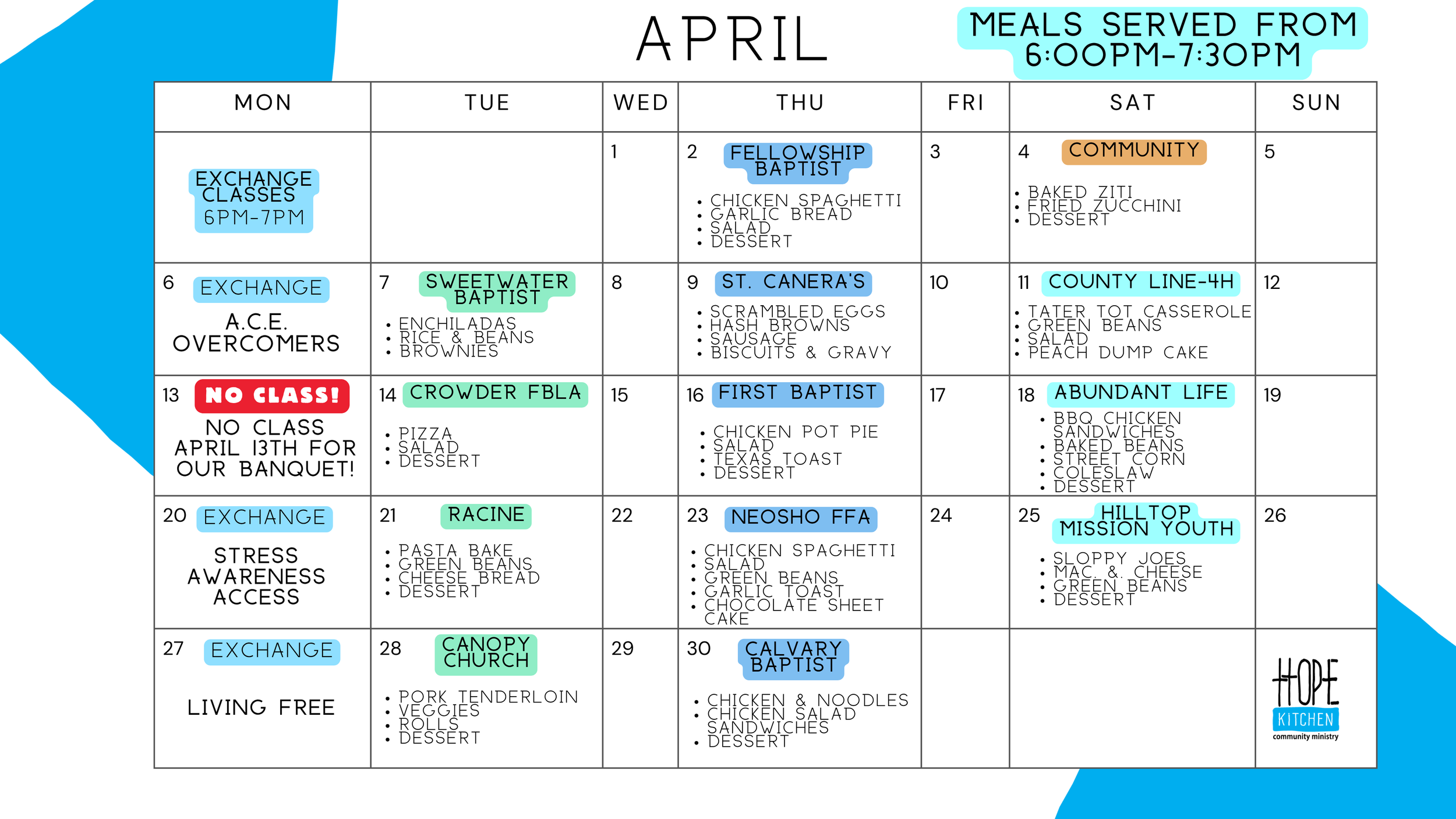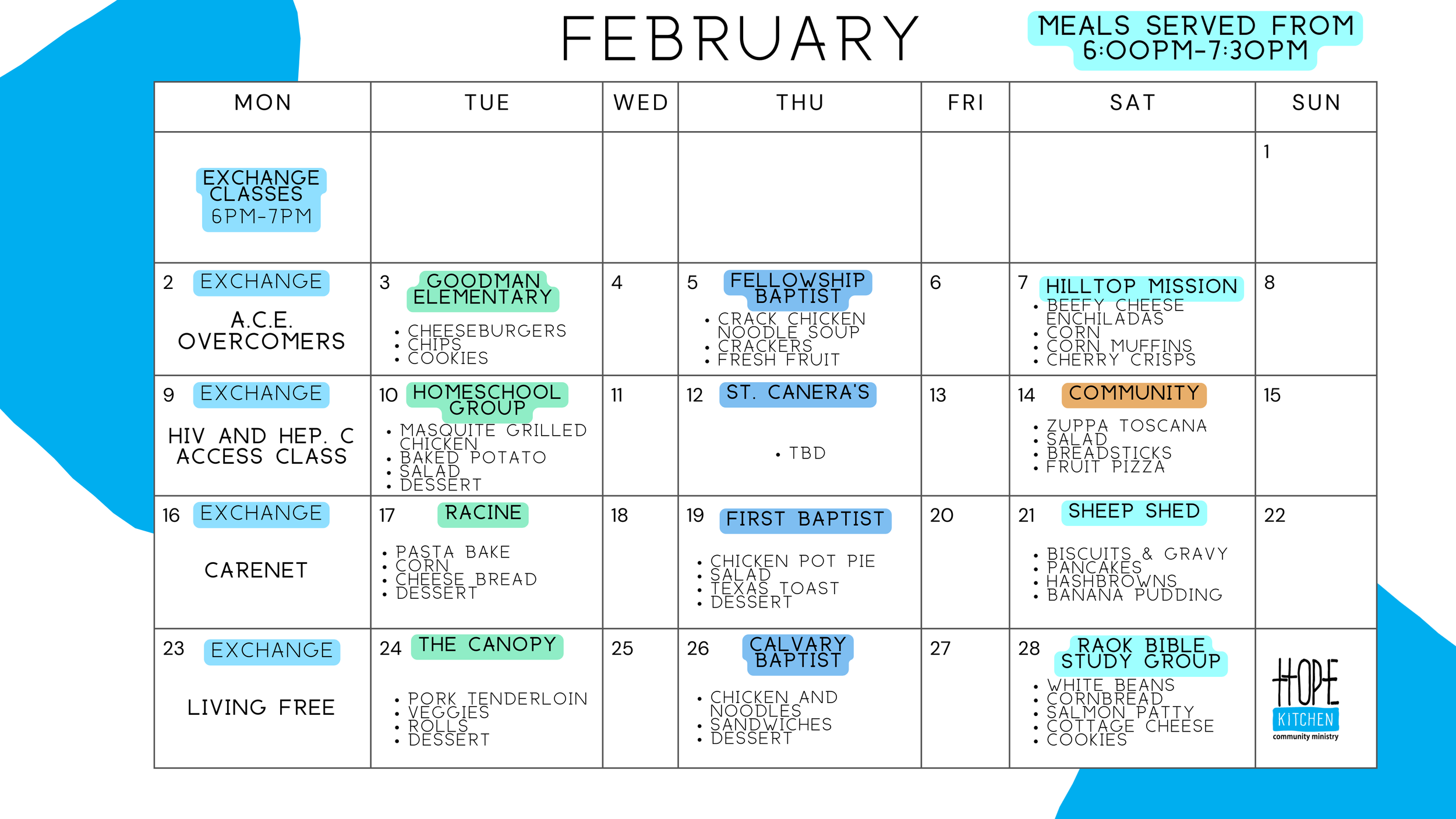 Hope Kitchen includes a Health Department inspected, commercial kitchen area ready for use by volunteers, dining area with seating for 60+, and a paid administrator to coordinate volunteer teams and schedules.