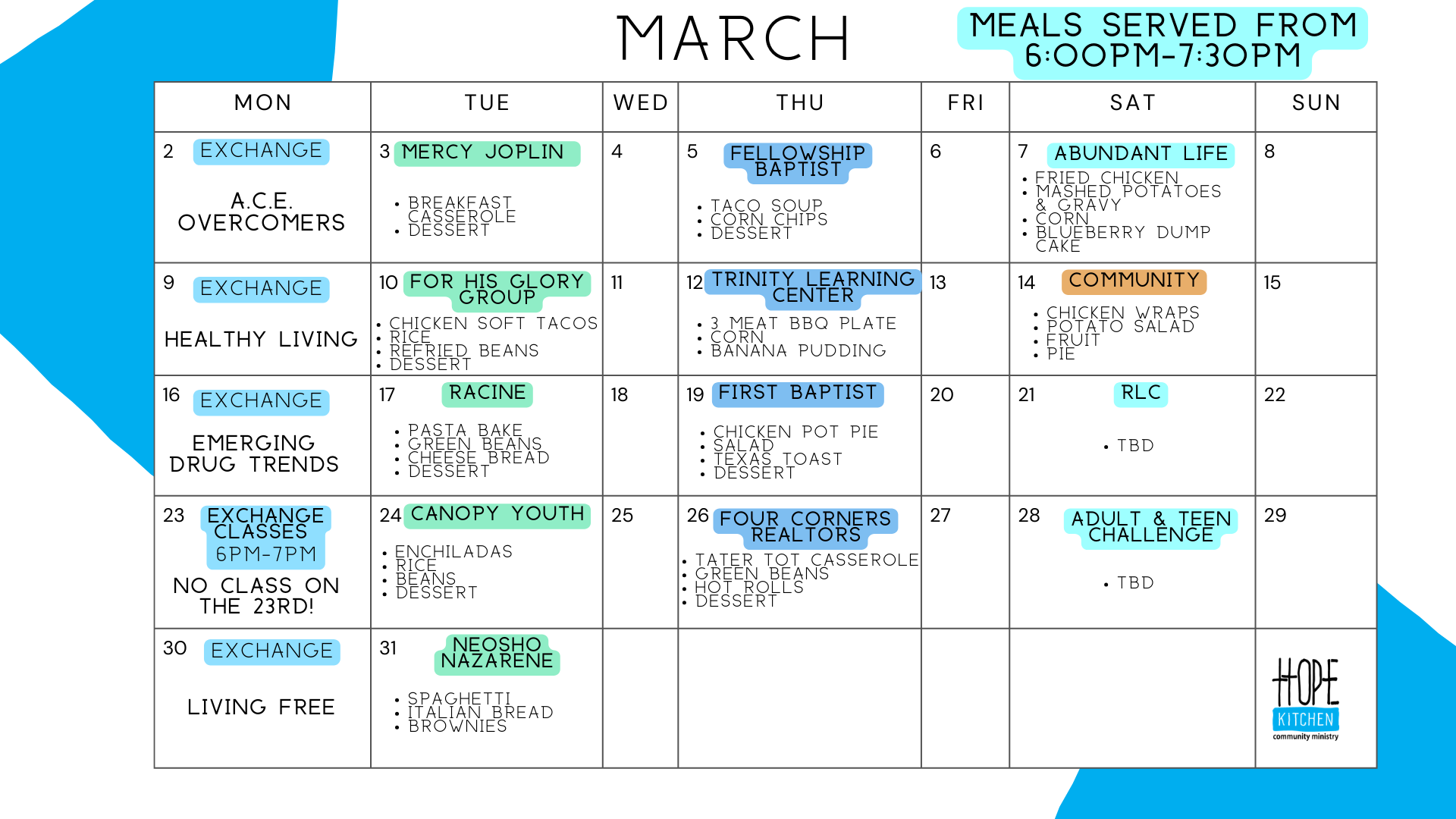 Hope Kitchen is open every Tuesday, Thursday, and Saturday for dinner from 6-7:30.